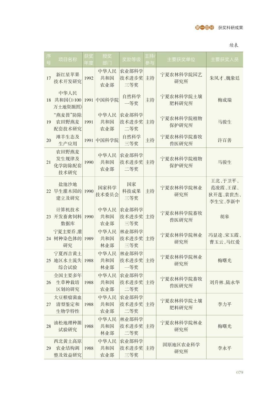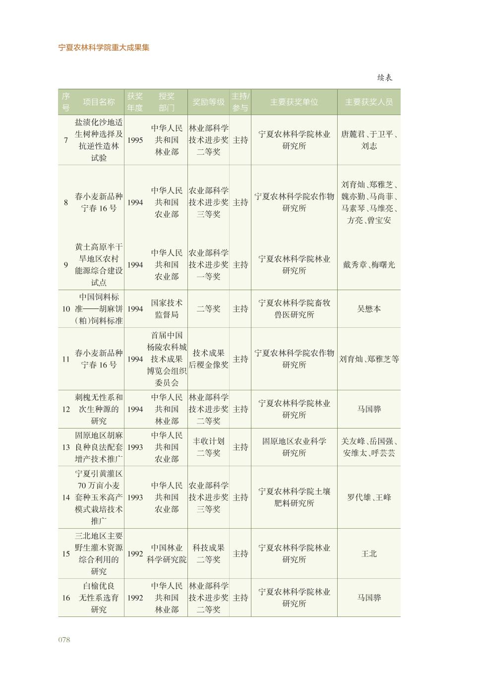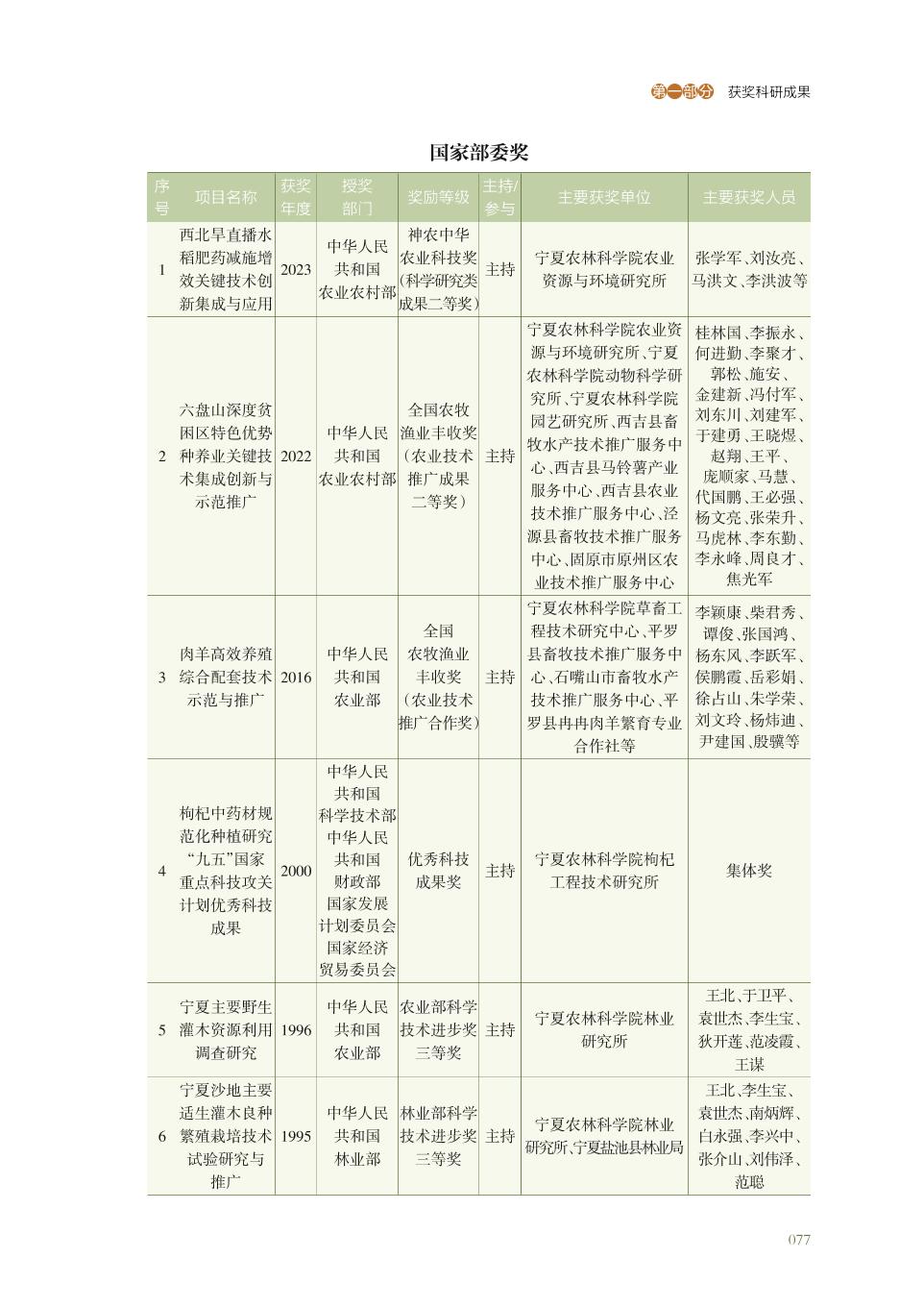 宁夏农林科学院获得国家部委奖科研成果名录