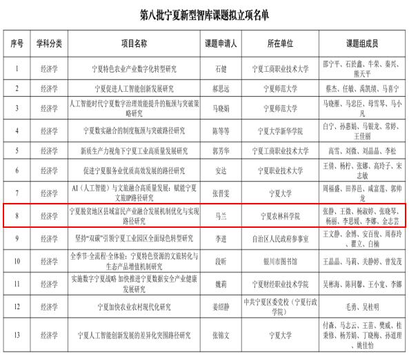 近日,宁夏社科规划办公布了《第八批宁夏新型智库课题拟立项名单》,宁夏农林科学院农业经济与信息技术研究所青年科研人员申报的《宁夏脱贫地区县域富民产业融合发展机制优化与实现路径研究》课题获批立项,系首次获批该领域课题。该课题聚焦我区脱贫地区县域富民产业发展难点和农民参与堵点,拟通过厘清富民产业融合发展的现实困境,提炼富民产业融合发展的经验启示,优化富民产业融合发展机制,提出脱贫地区县域富民产业融合发展的实现路径与对策建议,为巩固拓展脱贫攻坚成果同乡村振兴有效衔接提供现实参考。