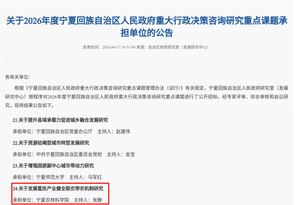 近日,宁夏回族自治区人民政府研究室(发展研究中心)发布《关于2026年度宁夏回族自治区人民政府重大行政决策咨询研究重点课题承担单位的公告》,宁夏农林科学院农业经济与信息技术研究所申报的《关于发展富民产业健全联农带农机制研究》课题获批立项。该课题聚焦宁夏枸杞、盐池滩羊两大标志性富民产业发展瓶颈与农户增收核心诉求,拟通过测度三产融合与联农带农效应,提炼富民产业差异化联农带农模式,提出政策建议与决策支撑方案,为优化富民产业联农带农机制、推动农民共享产业增值收益提供科学决策参考。