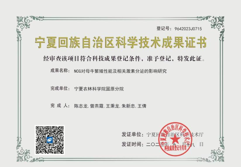 “NCG对母牛繁殖性能及相关激素分泌的影响及应用”系宁夏农林科学院固原分院草畜资源开发与利用团队自主研发。根据《宁夏农林科学院科技成果转化管理办法》及有关规定,现面向社会征寻实施合作伙伴,希望有意向企业咨询洽谈成果转化事宜。截止日期至2024年3月13日。